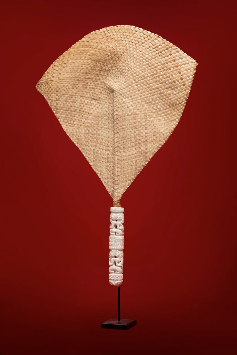 “Tahi’i”, a fan made from braided pandanus fiber and carved bovine bone, originates from the Marquesas Islands. Marquesan fans were considered objects of prestige and rank — among the most exquisite adornments in the Polynesian world. Traditionally, only warriors or high-ranking men and women were allowed to carry them, as a symbol of status and authority.