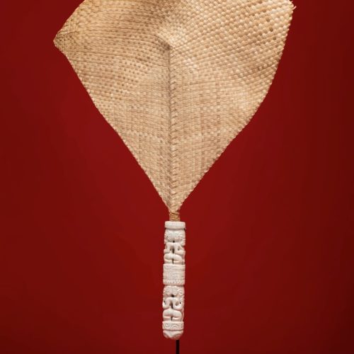 Lance en rostre d’espadon, bois et os de boeuf sculptés et ornée d’une Perle de Tahiti sur un socle en os de boeuf et bois.